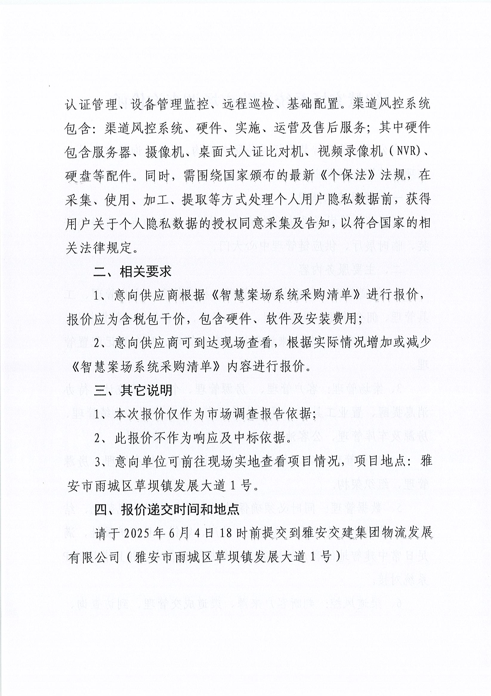 雅安交建集團(tuán)物流發(fā)展有限公司智慧案場系統(tǒng)采購市場調(diào)查詢價函