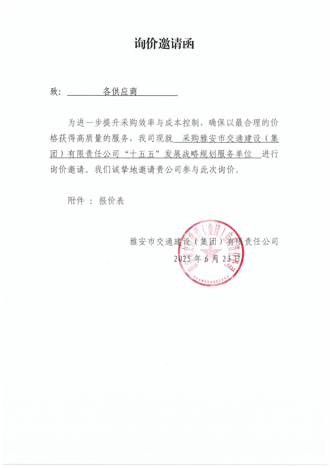 關(guān)于采購雅安市交通建設(shè)(集團)有限責(zé)任公司“十五五”發(fā)展戰(zhàn)略規(guī)劃服務(wù)單位的詢價