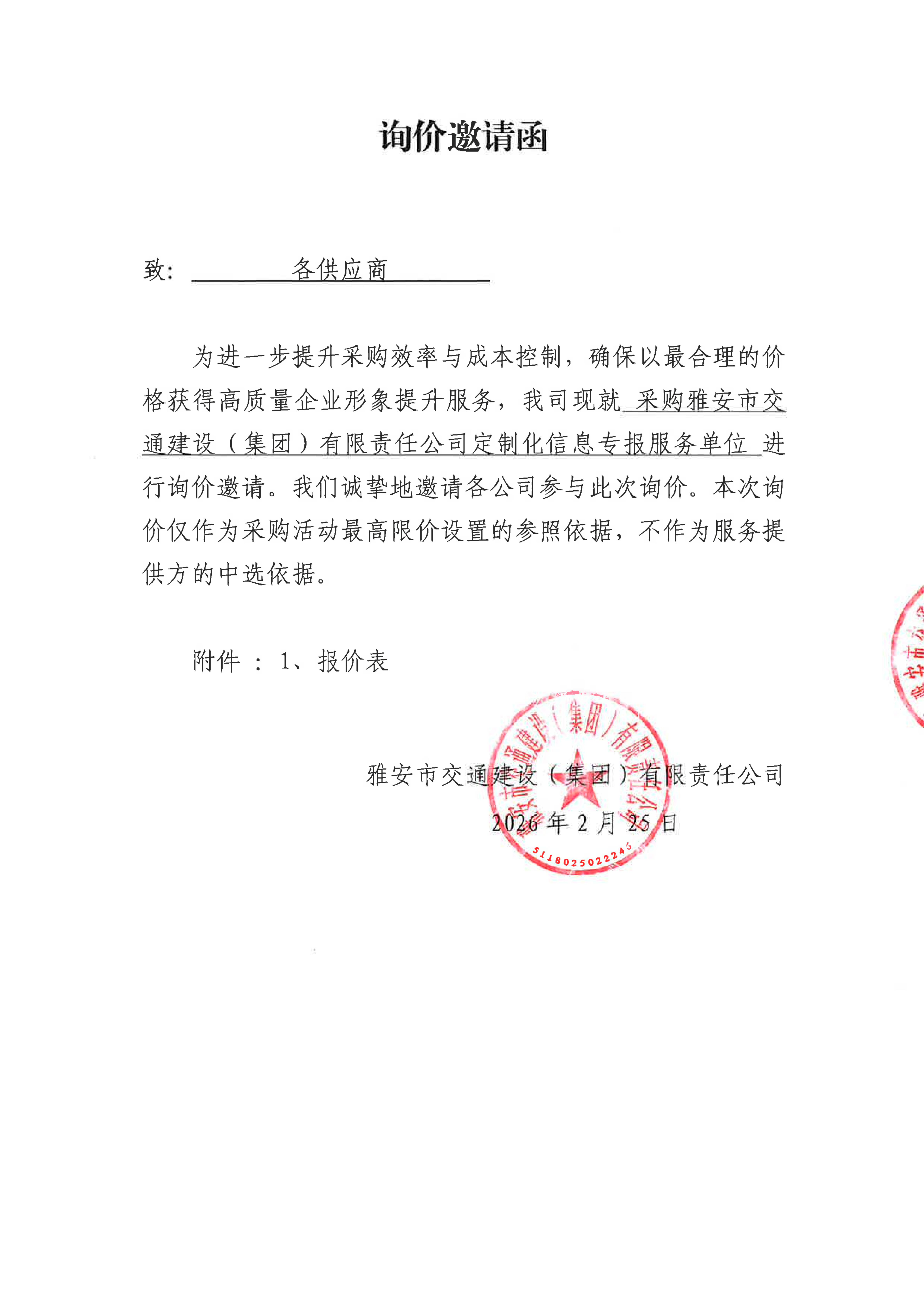 關于雅安市交通建設(集團)有限責任公司定制化信息專報服務采購限價的詢價函