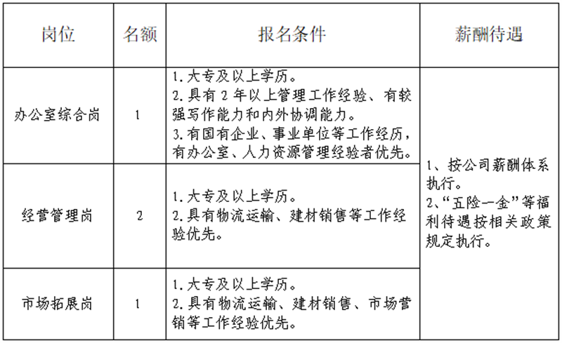 雅安交建集團(tuán)運(yùn)通貿(mào)易有限公司是雅安市交通建設(shè)(集團(tuán))有限責(zé)任公司下屬子公司。主要從事普通貨運(yùn)、建材銷售、供應(yīng)鏈管理、貨運(yùn)代理、貨運(yùn)信息咨詢服務(wù)、倉儲(chǔ)配送服務(wù)等工作,F(xiàn)根據(jù)公司業(yè)務(wù)發(fā)展需要,決定招聘4名工作人員,現(xiàn)將有關(guān)事項(xiàng)公告如下: