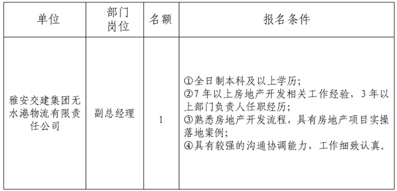 根據(jù)發(fā)展需要,現(xiàn)面向社會公開招聘雅安市交通建設(shè)(集團)有限責任公司(以下簡稱“雅安交建集團”)所屬子公司經(jīng)營班子人員1名,現(xiàn)將有關(guān)事項公告如下: