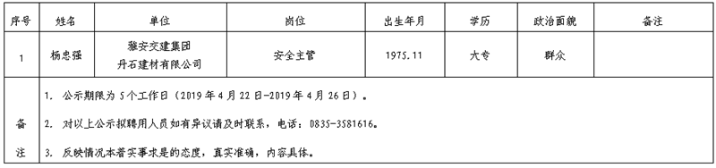 雅安交建集團子公司擬聘用人員公示(丹石建材公司)