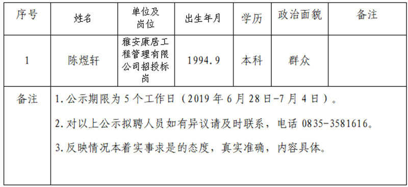 雅安交建集團(tuán)子公司擬聘用人員公示 (康居公司)