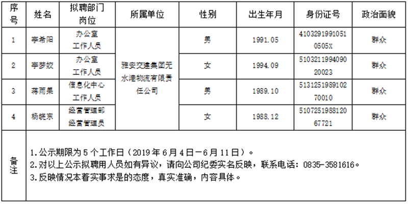 雅安交建集團(tuán)所屬子公司擬聘用人員公示(無水港公司)