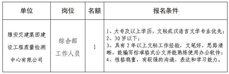 根據(jù)發(fā)展需要,決定面向社會(huì)公開招聘雅安市交通建設(shè)(集團(tuán))有限責(zé)任公司(以下簡稱“雅安交建集團(tuán)”)所屬子公司工作人員1名,現(xiàn)將有關(guān)事項(xiàng)公告如下: