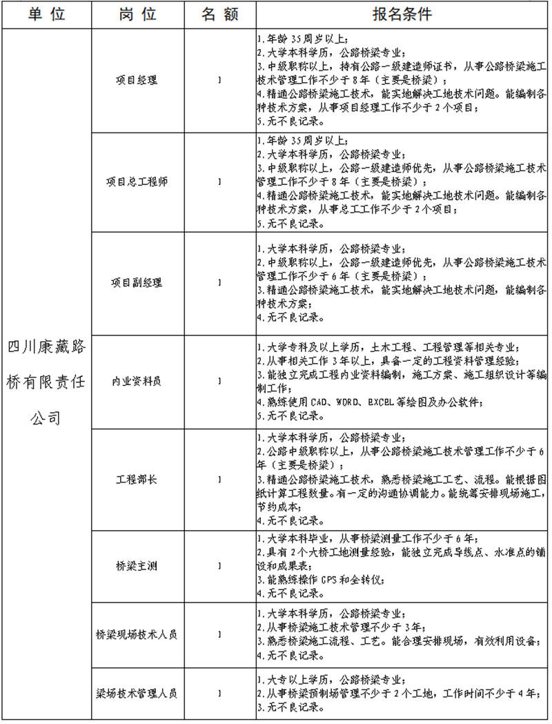 根據(jù)公司業(yè)務發(fā)展需要,決定面向社會公開招聘省道104線草壩至姚橋段改建項目部專業(yè)技術人才8名,現(xiàn)將有關事項公告如下: