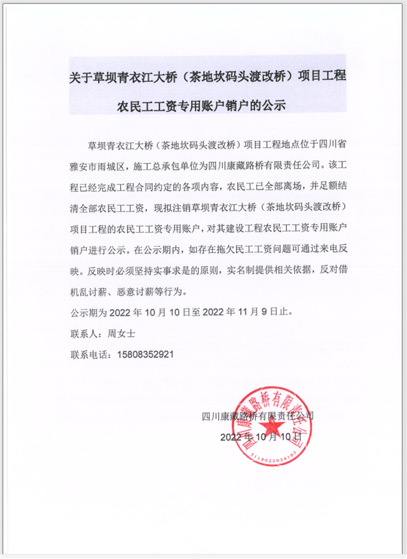 關(guān)于草壩青衣江大橋(茶地坎碼頭渡改橋)項(xiàng)目工程農(nóng)民工工資專用賬戶銷(xiāo)戶的公告