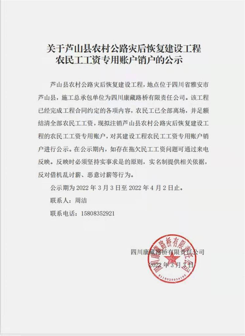 關(guān)于蘆山縣農(nóng)村公路災(zāi)后恢復(fù)建設(shè)工程 農(nóng)民工工資專(zhuān)用賬戶(hù)銷(xiāo)戶(hù)的公示