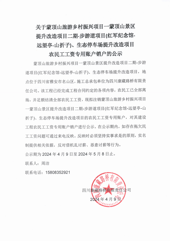 關于蒙頂山旅游鄉(xiāng)村振興項目一蒙頂山景區(qū)提升改造項目二期-步游道項目(紅軍紀念館遠望亭-山折子)、生態(tài)停車場提升改造項目農(nóng)民工工資專用賬戶銷戶的公示