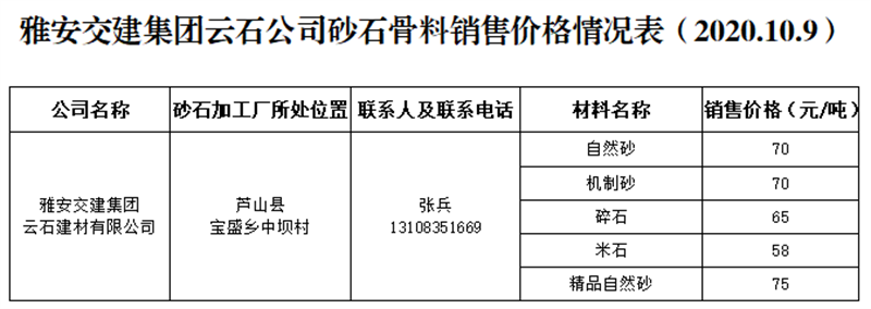 ÑŰ²½»½¨¼¯ˆF(tu¨¢n)ÔÆÊ¯¹«Ë¾É°Ê¯¹ÇÁÏäNÊÛƒr(ji¨¤)¸ñÇé›r±í£¨2020.10.9£©