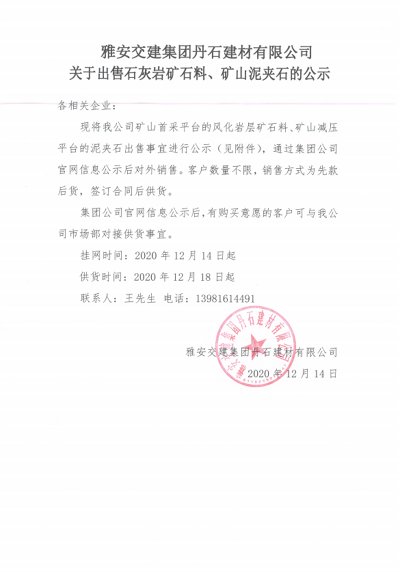 雅安交建集團(tuán)丹石建材有限公司關(guān)于出售石灰?guī)r礦山料、礦山泥夾石的公示
