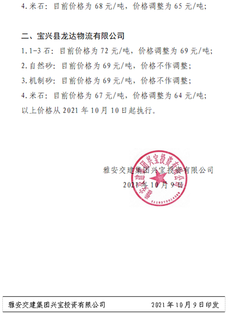 雅安交建集團(tuán)興寶公司關(guān)于調(diào)整成品料銷售價格的通知(2021.10.9)