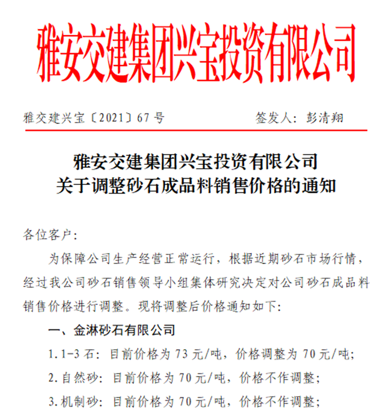 雅安交建集團(tuán)興寶公司關(guān)于調(diào)整砂石成品料銷售價格的通知(2021.9.28)