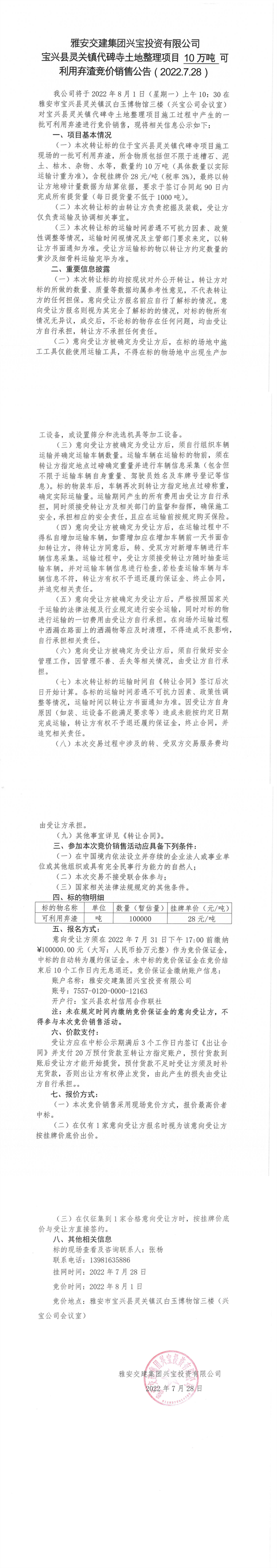 雅安交建集團(tuán)興寶投資有限公司靈關(guān)鎮(zhèn)代碑寺土地整理項(xiàng)目10萬噸可利用棄渣競價(jià)銷售公告(2022.7.28)