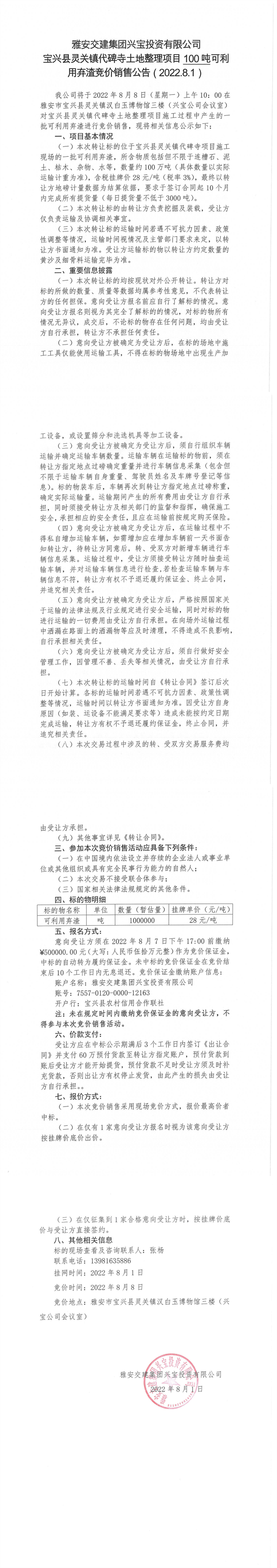 雅安交建集團(tuán)興寶投資有限公司靈關(guān)鎮(zhèn)代碑寺土地整理項(xiàng)目100萬噸可利用棄渣競(jìng)價(jià)銷售公告(2022.8.1)