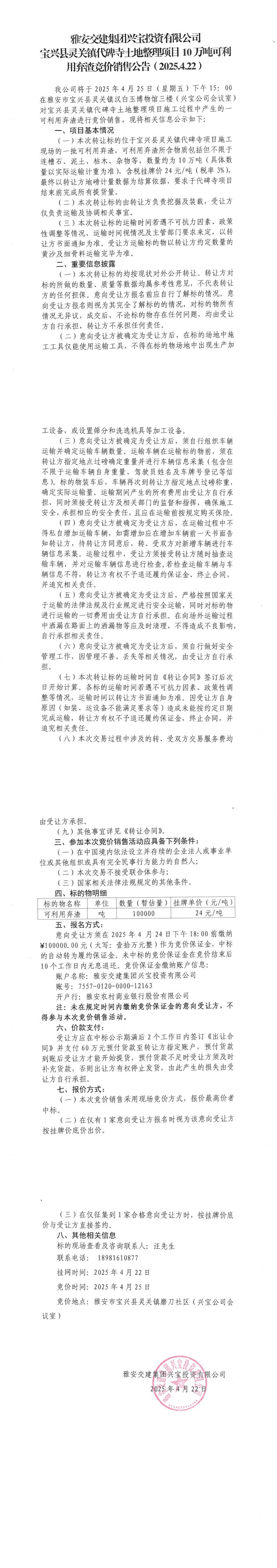 雅安交建集團(tuán)興寶投資有限公司寶興縣靈關(guān)鎮(zhèn)代碑寺土地整理項(xiàng)目10萬噸可利用棄渣競價銷售公告